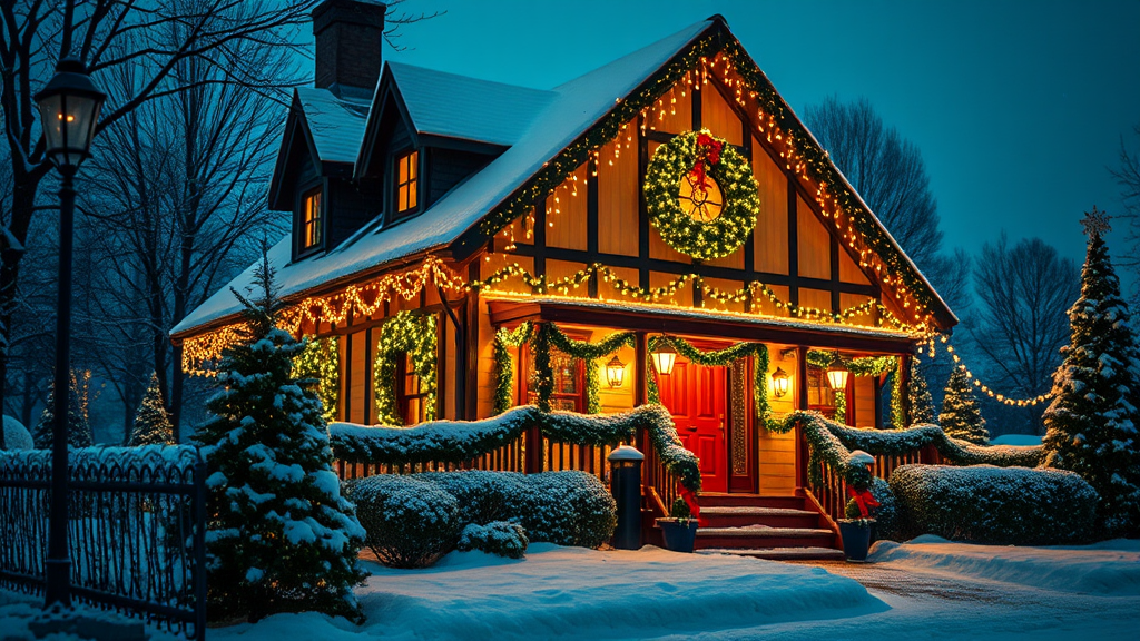 A picturesque Christmas house adorned with sparkling lights and festive garlands, nestled in a winter wonderland with snow gently falling, all captured in stunning HD quality for a cinematic atmosphere.