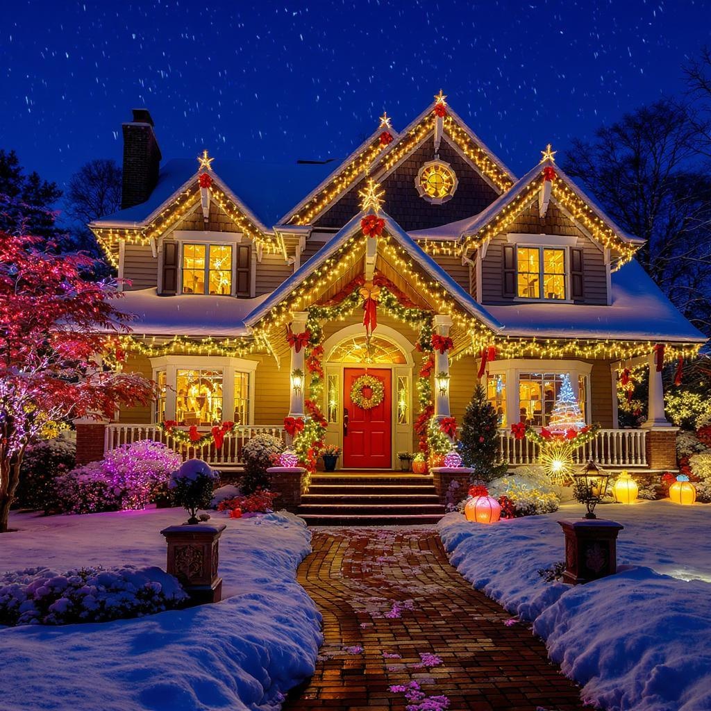 A picturesque home adorned with enchanting Christmas decorations, twinkling lights illuminating the snowy landscape, vibrant garlands and shimmering ornaments framing the entryway, all captured in a breathtaking cinematic scene that exudes a warm and festive holiday ambiance in high-definition clarity.