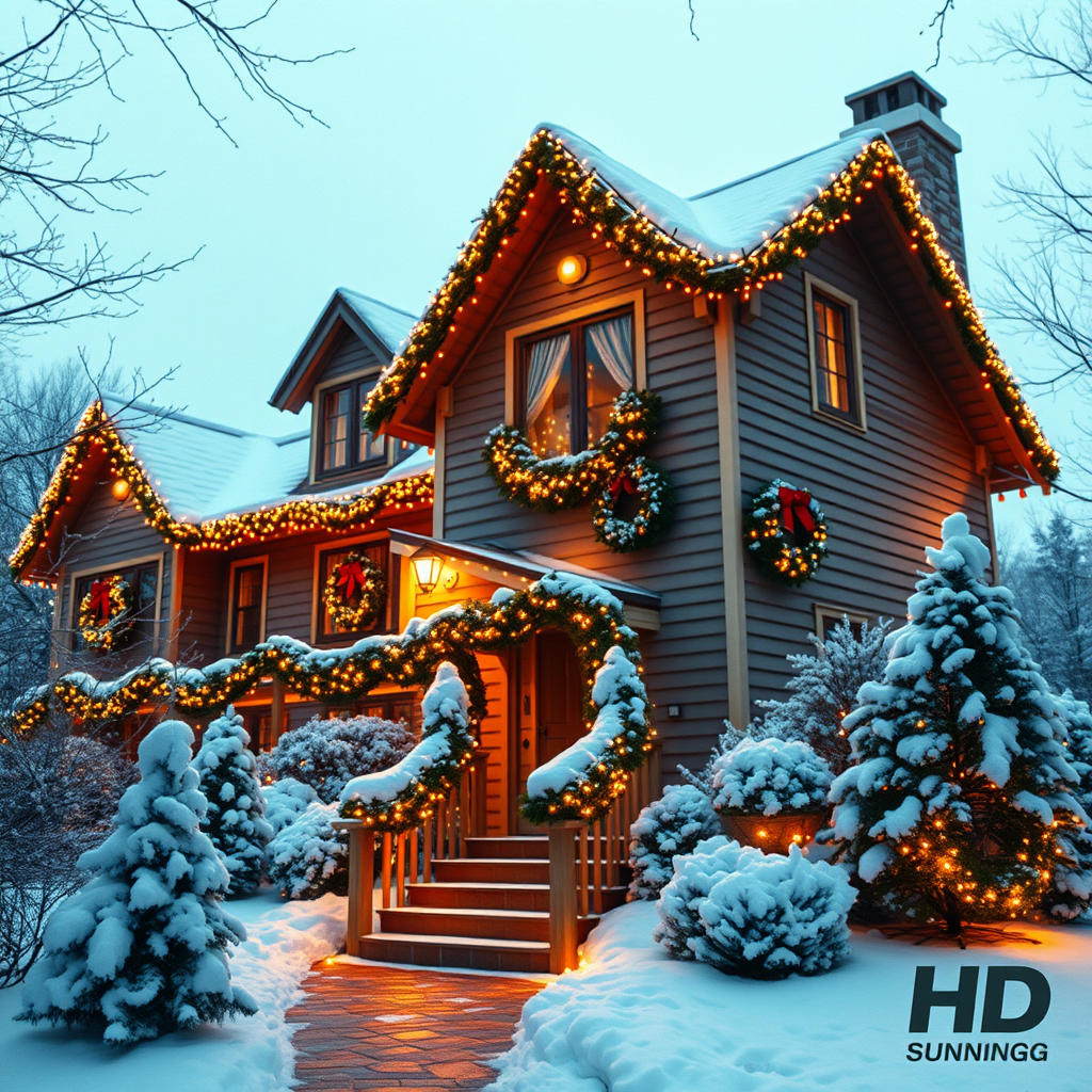 A picturesque home adorned with twinkling Christmas lights, nestled in a snowy landscape; warm golden glows illuminate festive wreaths and garlands, casting a magical, cinematic ambiance in stunning HD quality.