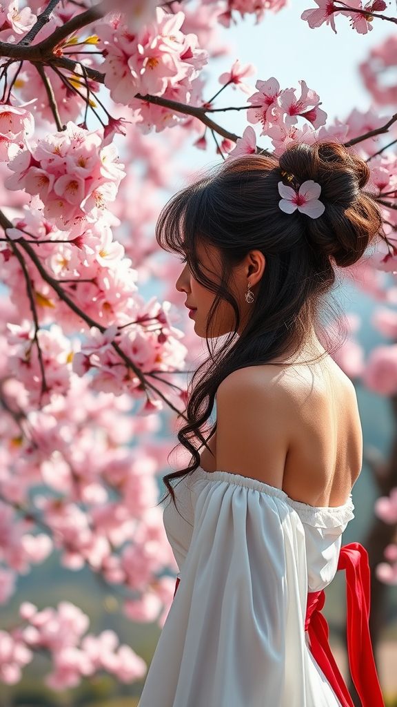 A picturesque landscape featuring cherry blossoms in full bloom, their delicate pink petals exuding a serene, calming beauty. The scene is tranquil, offering a harmonious backdrop to the striking figure of a woman in the foreground, whose vibrant elegance complements the natural splendor around her. The setting captures an enchanting blend of nature and human allure, as the blossoms gently sway in the light breeze, their subtle fragrance enhancing the peaceful atmosphere. The woman's graceful presence adds a rich layer of contrast to the gentle landscape, creating a captivating and timeless moment.