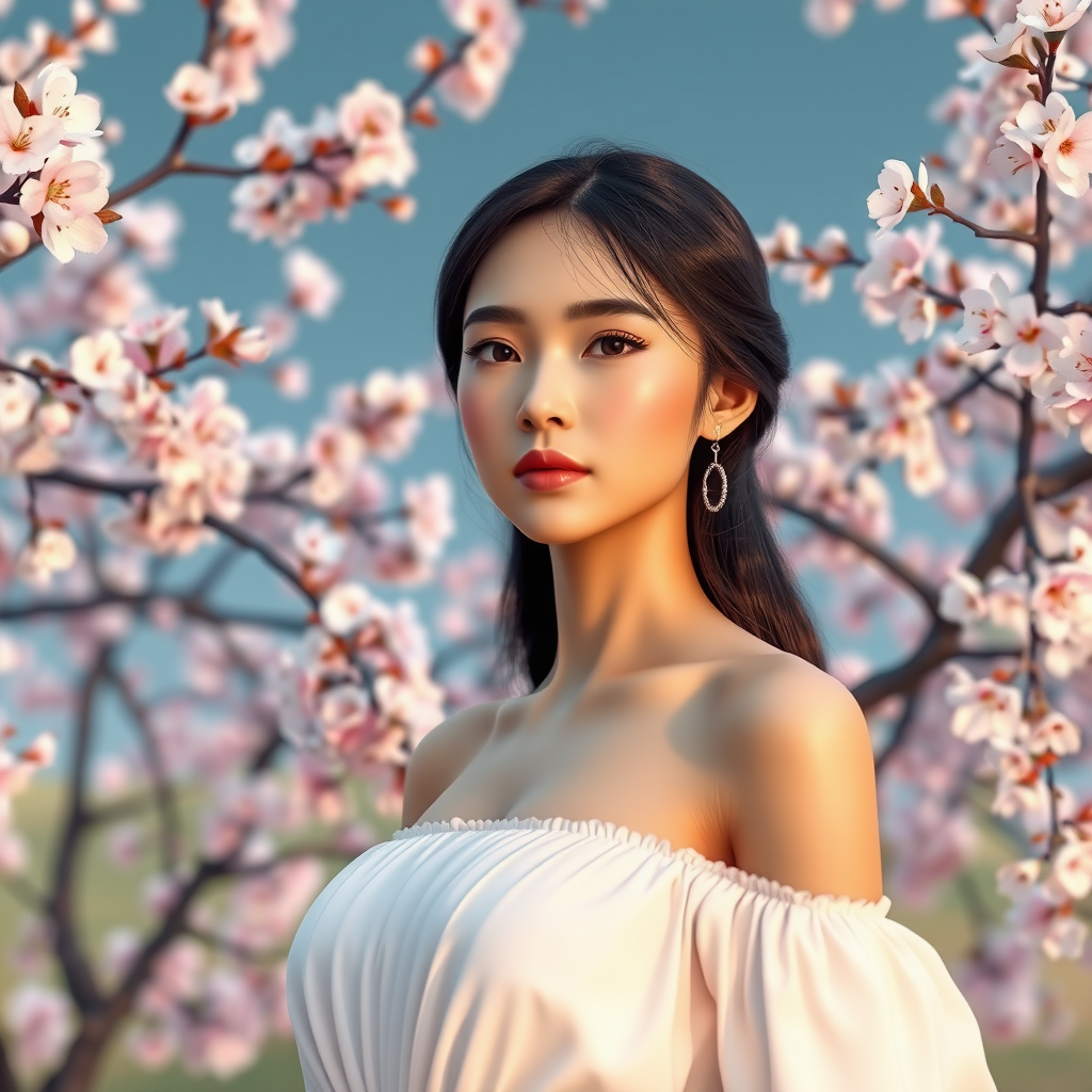 A picturesque landscape of cherry blossoms with soft pink blooms evokes a sense of calm and natural beauty. The tranquil scene highlights the striking contrast with a woman in the foreground, radiating vibrant elegance. This CGI 3D render showcases detailed and visually harmonious elements, focusing on the serene ambiance and graceful presence within the landscape.