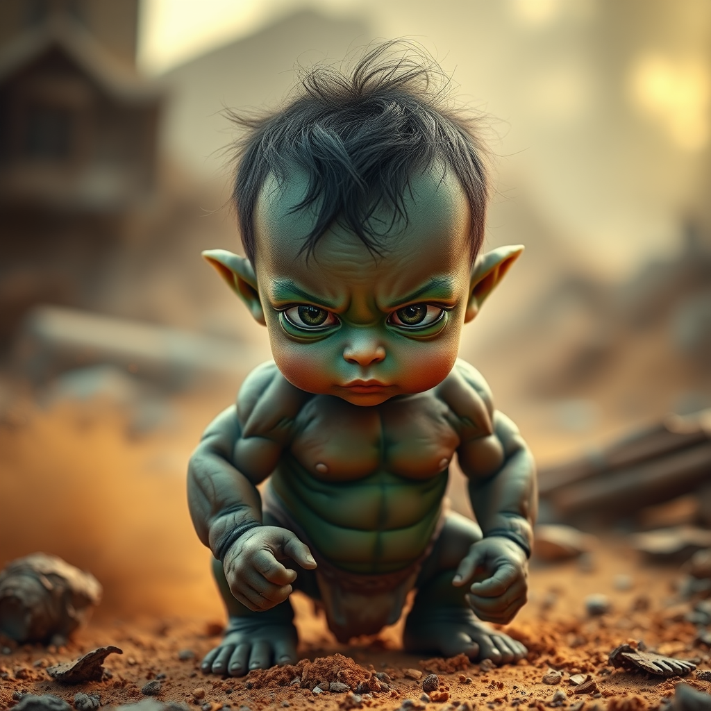 A pint-sized but powerfully built baby with a vibrant green hue, eyes glowing with intensity, surrounded by a cinematic landscape of destruction with dust swirling and debris scattered, capturing the essence of raw strength in a miniature form.