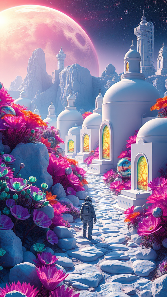 A pioneering human colony on an uncharted planet showcases pristine white structures set against a backdrop of vividly colored flora, with bioluminescent plants casting ethereal glows. The scene is depicted in hyperrealism, featuring extraordinary detail and intricate patterns reminiscent of crystalline structures. The image captures global illumination effects, with a lone cosmonaut exploring this vibrant landscape. Elements such as lens flare add depth, although the image is marred by textural issues like low-resolution jpeg artifacts. Anomalies include anatomical errors like extra digits or missing fingers, as well as possible disfigurements or mutations in the depicted figures. Despite these distortions, the atmosphere remains captivating, inviting further exploration and imagination.