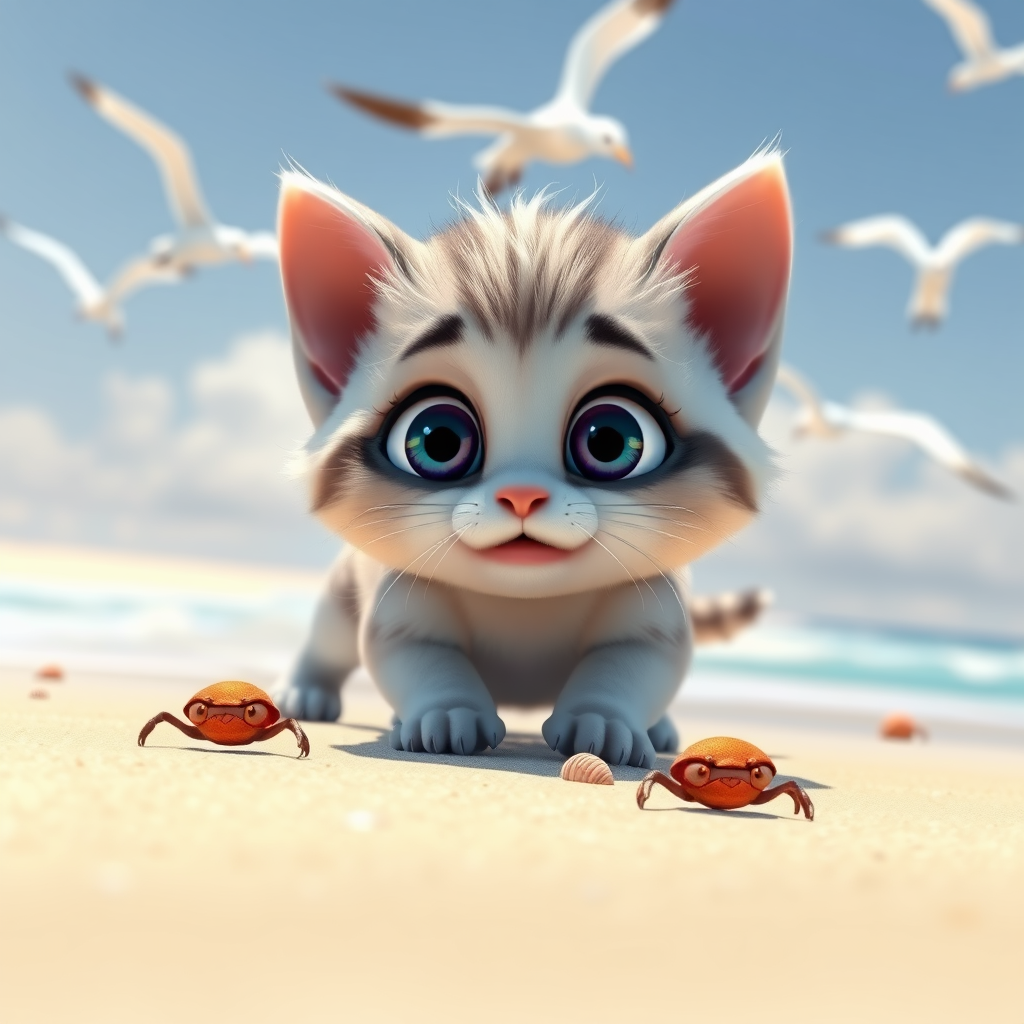 A Pixar 3D render of a curious kitten playfully exploring a sunlit beach, its big eyes wide with wonder and excitement. The kitten's expressive face is both adorable and charming, perfectly capturing its lively movements as it pounces at small crabs or investigates seashells, reminiscent of the whimsical animation style of "Finding Nemo." The bright, sunny scene is filled with soft pastel hues and cartoonish exaggeration, with gentle waves lapping at the shore and seagulls playfully swooping in the background.