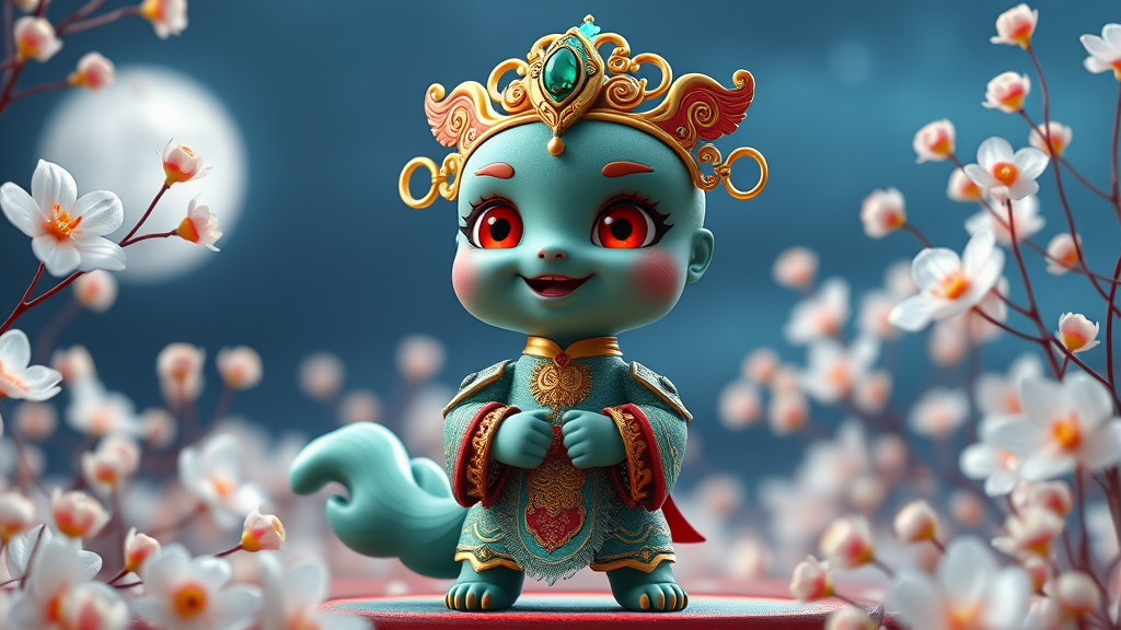 A Pixar-inspired character with a blend of Chinese style and realism, featuring an exquisitely cute appearance. Adorned with an emerald crown and wearing a royal costume enhanced with intricate gold accessories, the character exhibits lifelike metal designs. With captivating red eyes and a charming tail, the figure’s delicate hands and feet are highlighted with super detailed craftsmanship. The scene is enriched with an abundance of crystal flowers under a soft moonlight effect, achieving a balance between real and fantastical elements. The character exudes beauty reminiscent of the Aurora, with an ultra HD panoramic view, captured in a full body shot. Standing in a joyous posture with a beaming smile, the setting incorporates occine value lighting that's safe for visuals, rendered in dazzling blue ultra HD quality, 16K resolution, emphasizing meticulous and complex details throughout.
