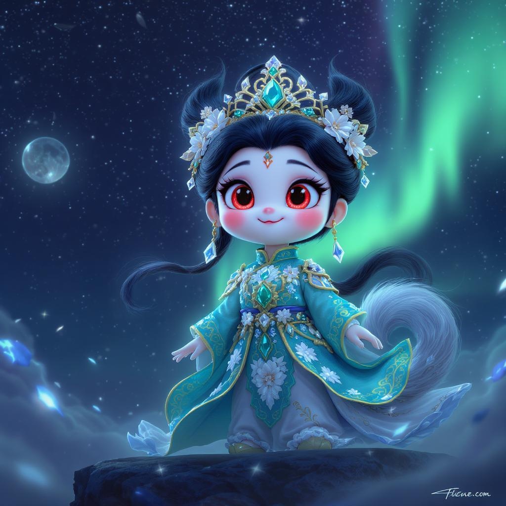 A Pixar-inspired, realistic depiction of a Chinese-style character exuding cuteness and regality. They are adorned with an emerald crown and a royal costume embellished with intricate gold accessories. The lifelike design features red, expressive eyes, an adorable tail, and delicate hands and feet. The ensemble is adorned with an abundance of crystal flowers, reflecting a moonlit glow. The composition captures an ultra HD, panoramic, full-body image, showcasing a blissful smile and confident posture. The scene is bathed in the ethereal colors of the Aurora, capturing a serene beauty in ultra HD 16K quality, highlighted by occine value light. The character's overall presentation is full of life and charm, with the blue hue adding depth to the scene.