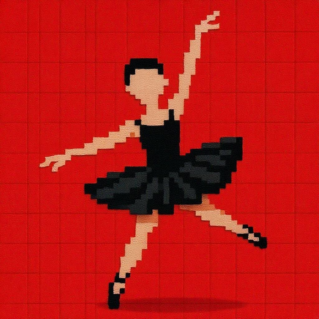 A pixelated ballerina in a black tutu gracefully twirls across a vibrant red square background, her movements captured in minimalist detail.