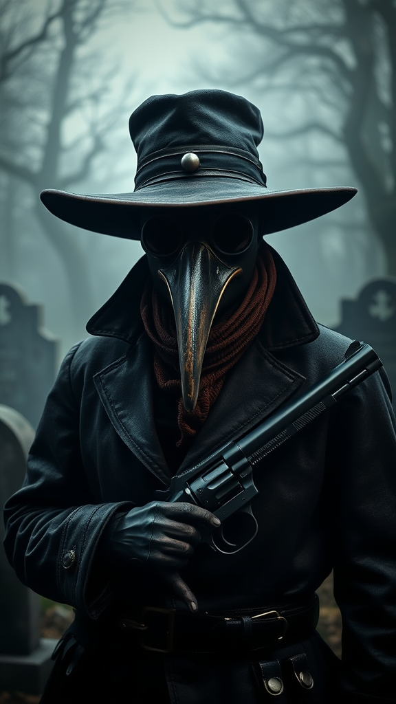 A plague doctor from the 17th century stands in a fog-laden graveyard, shrouded in an aura of mystery. He dons the iconic wide-brimmed hat and a beak-like mask, both crafted from aged leather. In a modern twist, a 6-shooter revolver rests at his side, adding an unusual element to his historical attire. The scene is captured in epic fantasy style, rendered in 8k resolution. Cinematic lighting bathes the intricate details of the doctor’s attire and the atmospheric surroundings. Every feature is captured in sharp focus, bringing a photorealistic quality to the complex medieval environment. Rendered with hyper-realistic techniques, the scene melds the haunting allure of the past with a touch of the surreal.