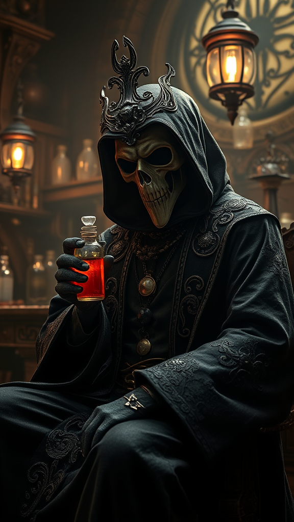 A plague doctor seated with a mysterious vial in hand within an ancient laboratory, wearing an intricately designed mask and an ornate, elegant black robe adorned with elaborate details; fantasy art rendered in high definition with meticulous detail; ambient occlusion, glowing elements, rich shadows, and a rough yet shimmering texture enhanced by ray tracing reflections; features lumen and screen space reflections, with diffraction grating effects creating a supernova-like aura; crafted in 8k resolution with dramatic volumetric lighting casting ethereal glows through the scene.