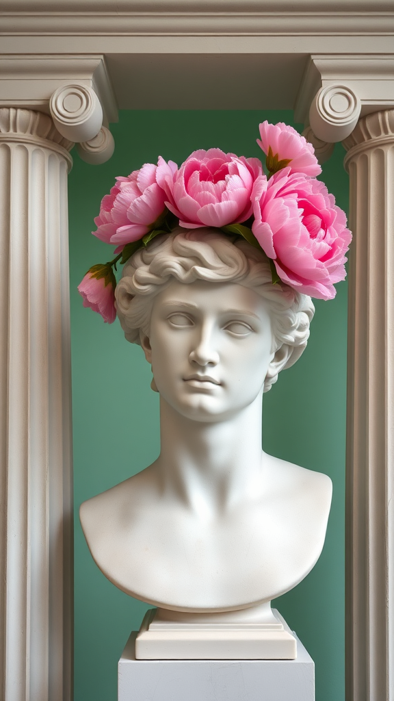 A plaster bust of David adorned with blooming pink peonies rests gracefully upon his head, framed by the elegant columns of the Doric order, set against a soothing mint green backdrop.