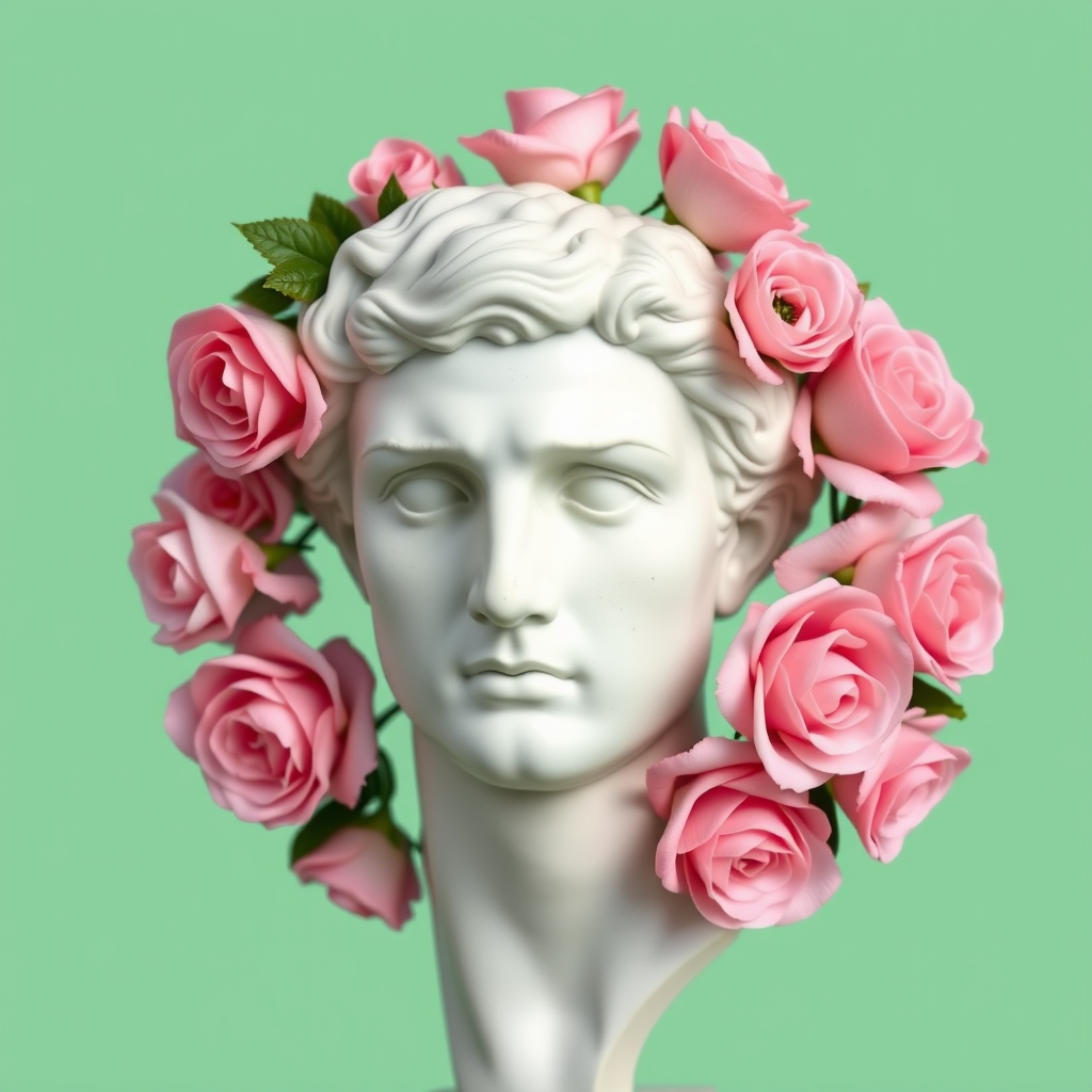 A plaster bust of David adorned with pink roses encircling the head, evoking the Doric order with its elegant simplicity, set against a fresh mint green background, aspect ratio 4:5.