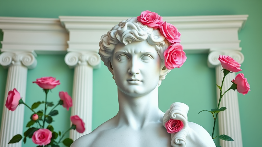 A plaster bust of David adorned with vibrant pink roses, set against a backdrop featuring elements of the Ionic order, all with a soft mint green background in a 4:5 aspect ratio.