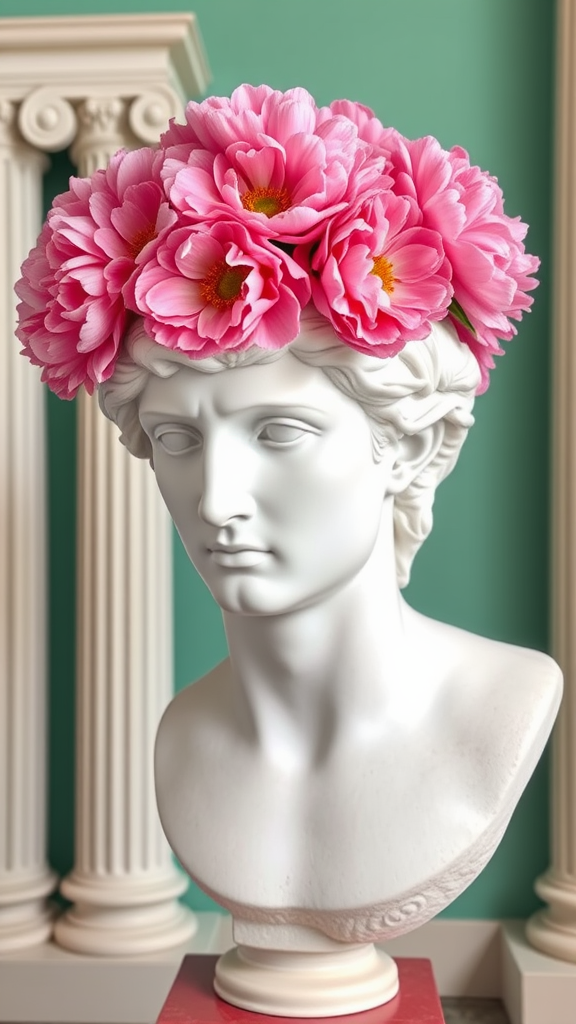 A plaster bust of David adorned with vibrant pink peonies crowning the head, set against a backdrop of classical Doric columns and a refreshing mint green background, capturing an air of timeless elegance and modern flair.