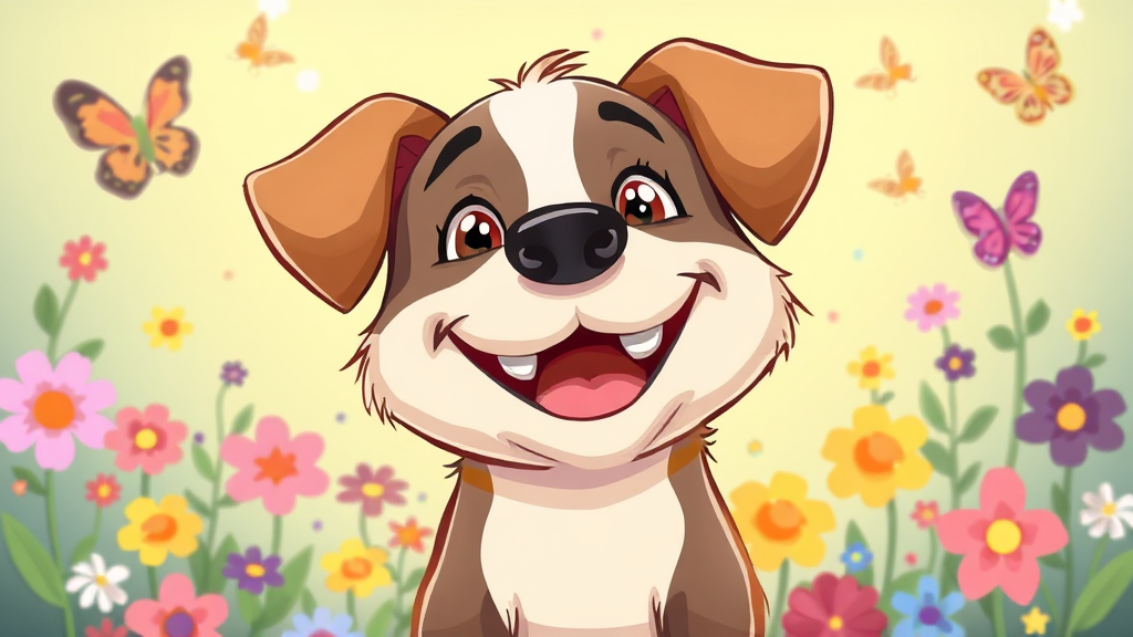 A playful and vibrant cartoon illustration of an adorable dog joyfully grinning at the viewer, its eyes sparkling with mischief, surrounded by a whimsical background of colorful flowers and bouncing butterflies.