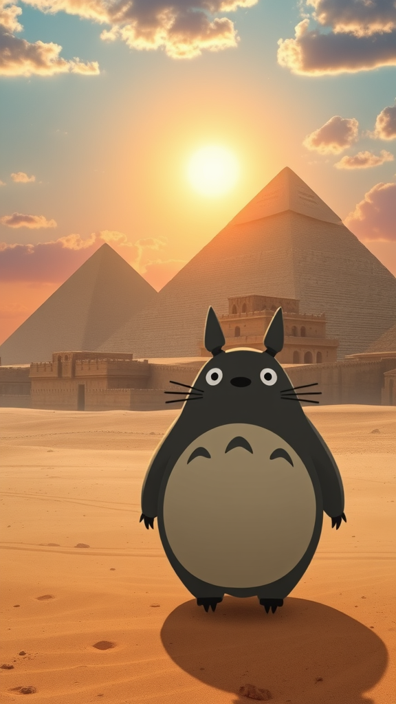 A playful and whimsical encounter where the gentle, towering figure of Totoro roams the sands before the majestic pyramids of Giza. Beneath a vibrant dawn sky, with the sun casting a golden glow over the ancient stones, Totoro's comforting presence adds a touch of magic to the timeless landscape. Balancing cultural wonder with animated charm, the scene creates a heartwarming fusion of history and fantasy, where Totoro's curious eyes and gentle nature blend seamlessly with the ancient grandeur of the pyramids.