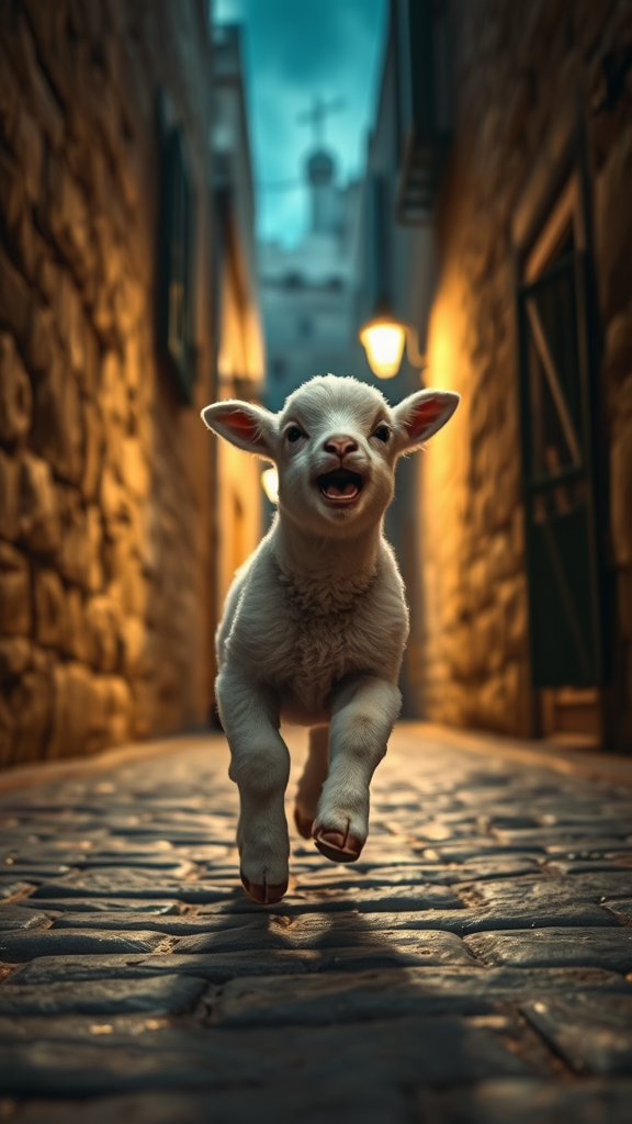 A playful baby lamb joyfully dashing through the ancient, winding streets of Jerusalem under the glow of dim, ambient streetlights; its infectious laughter echoing softly against timeworn stone walls. The scene is rendered in cinematic detail, capturing the contrast of the lamb's pure, fluffy coat against the textured cobblestones, all in hyper-realistic 4k clarity. The unique atmosphere blends the historic charm of the city with an almost magical, ethereal quality under the darkened sky.