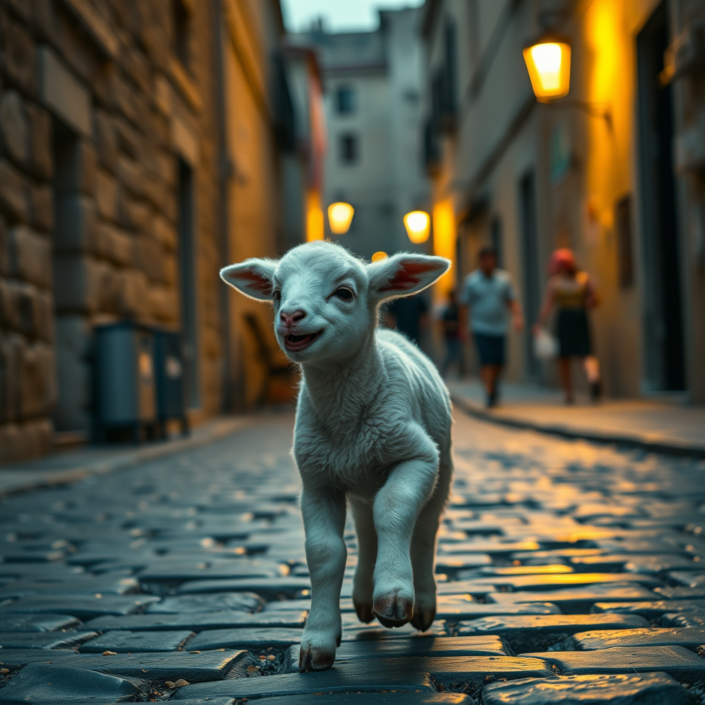 A playful baby lamb joyfully frolicking through the ancient streets of Jerusalem at dusk, its soft laughter echoing in the air, the scene illuminated by the warm glow of street lamps casting subtle shadows, cinematic and hyper-realistic detail in 4K, capturing every texture and nuance.