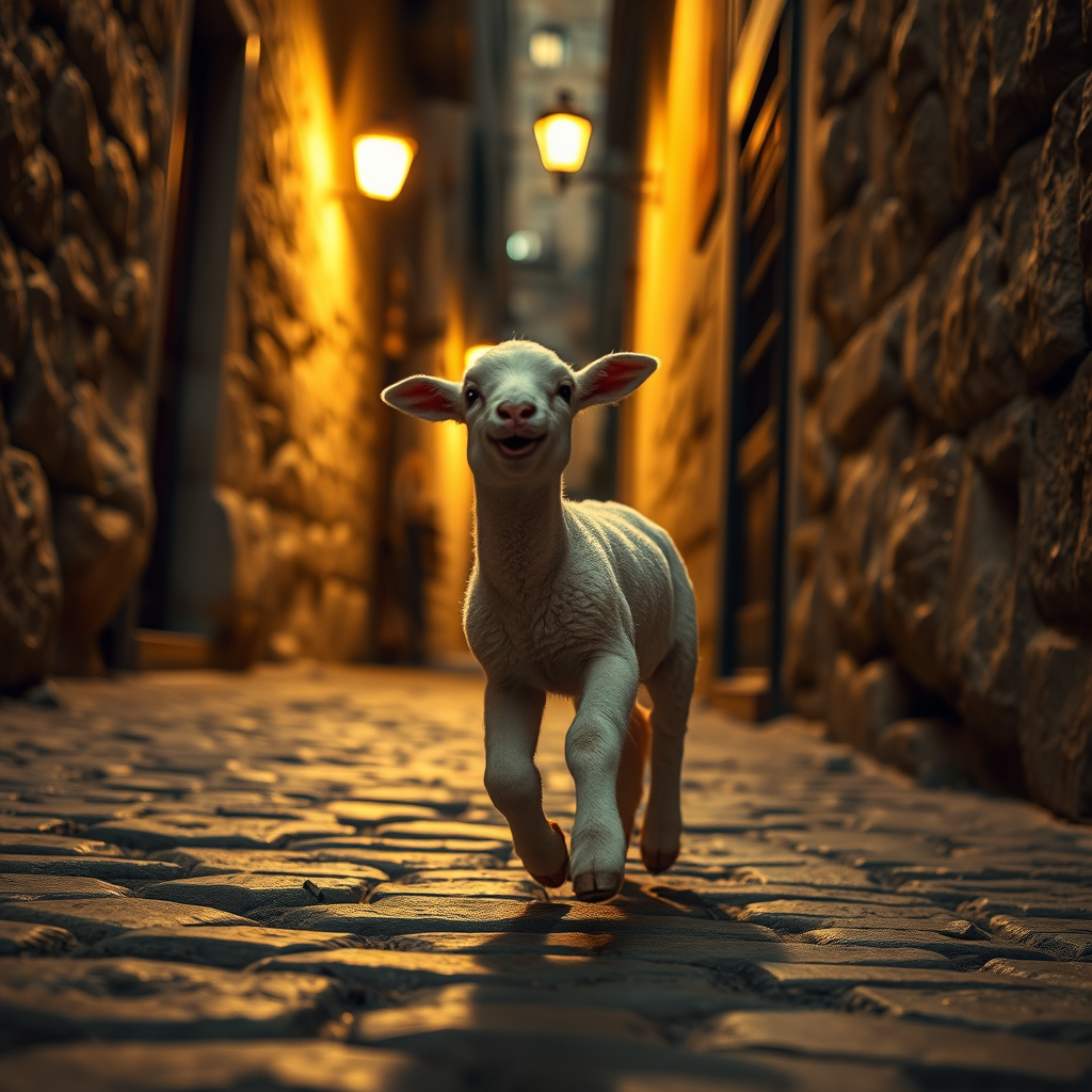 A playful baby lamb joyfully frolicking through the ancient streets of Jerusalem, its laughter echoing softly in the narrow alleys. The scene is captured under the mysterious glow of dim streetlights, creating a cinematic atmosphere. The hyper-realistic detail brings the scene to life with crisp 4K clarity, capturing the texture of the cobblestones and the gentle movements of the lamb as it explores its surroundings. The warm, ambient lights cast intriguing shadows, enhancing the rich textures and vibrant history of the cityscape.