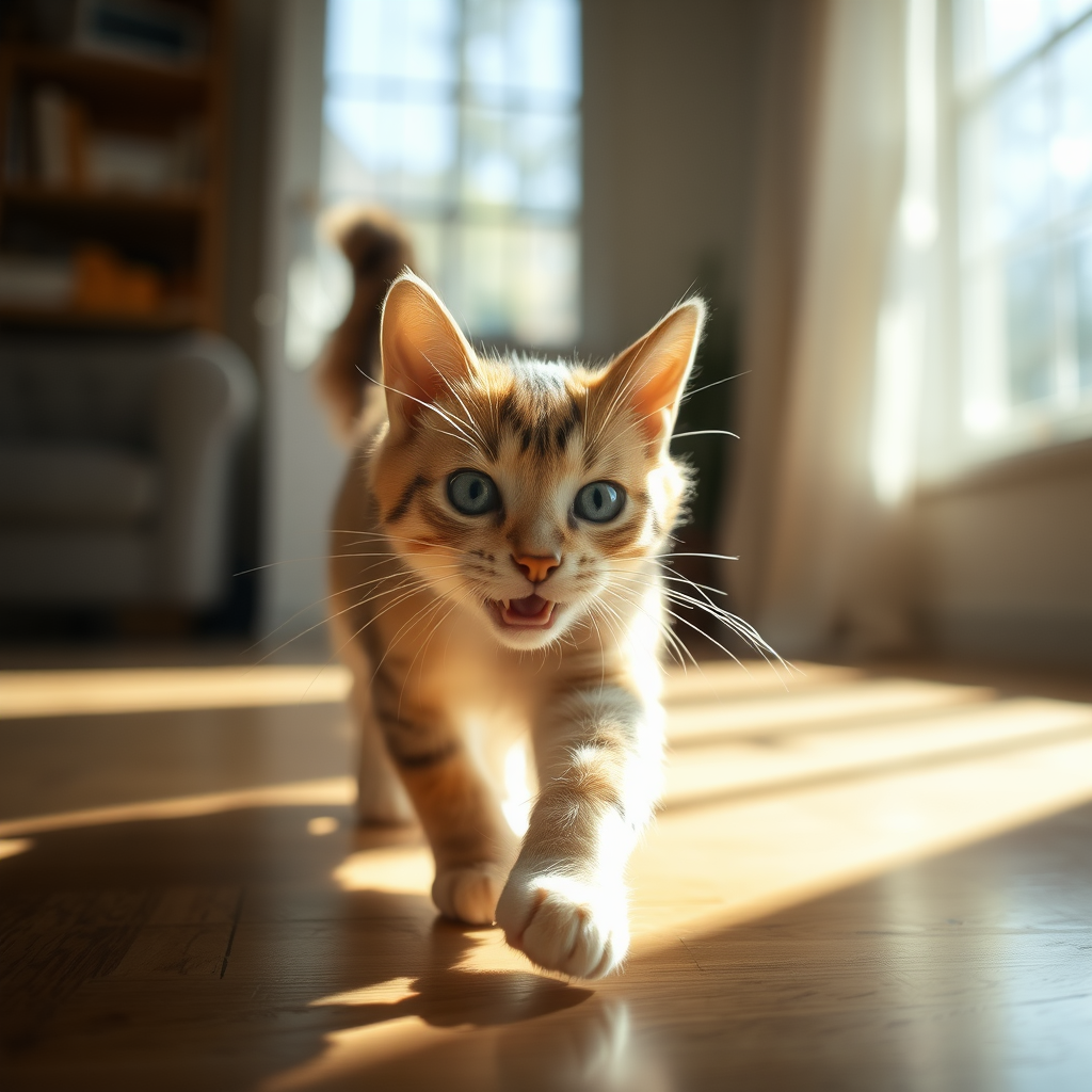 A playful cat chasing a beam of sunlight across a sunlit room, its whiskers twitching with excitement.