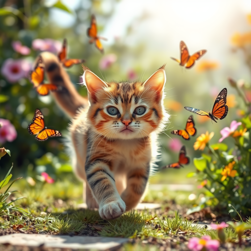 A playful cat with a mischievous grin pounces around, chasing colorful butterflies in a sunlit garden.