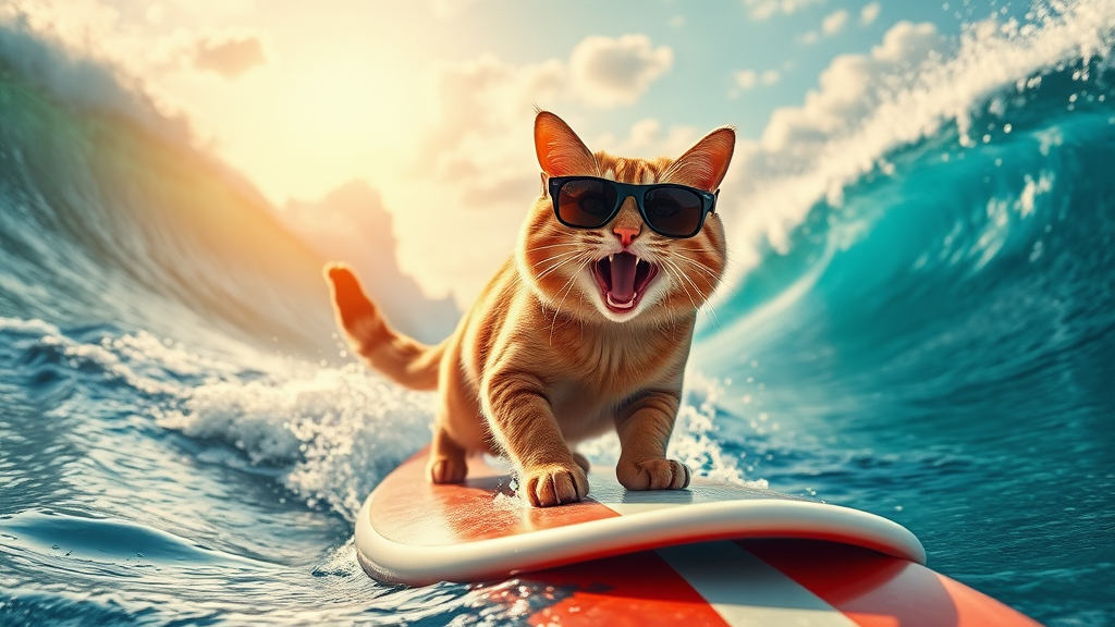A playful cat with sleek fur is riding a surfboard amidst towering waves. With the sun shining bright, the cat sports a pair of retro sunglasses and has its mouth open in a joyous meow. Captured in a nostalgic Polaroid photograph, the vibrant scene is filled with energy, as water splashes around and the horizon stretches into a cloud-dotted sky.