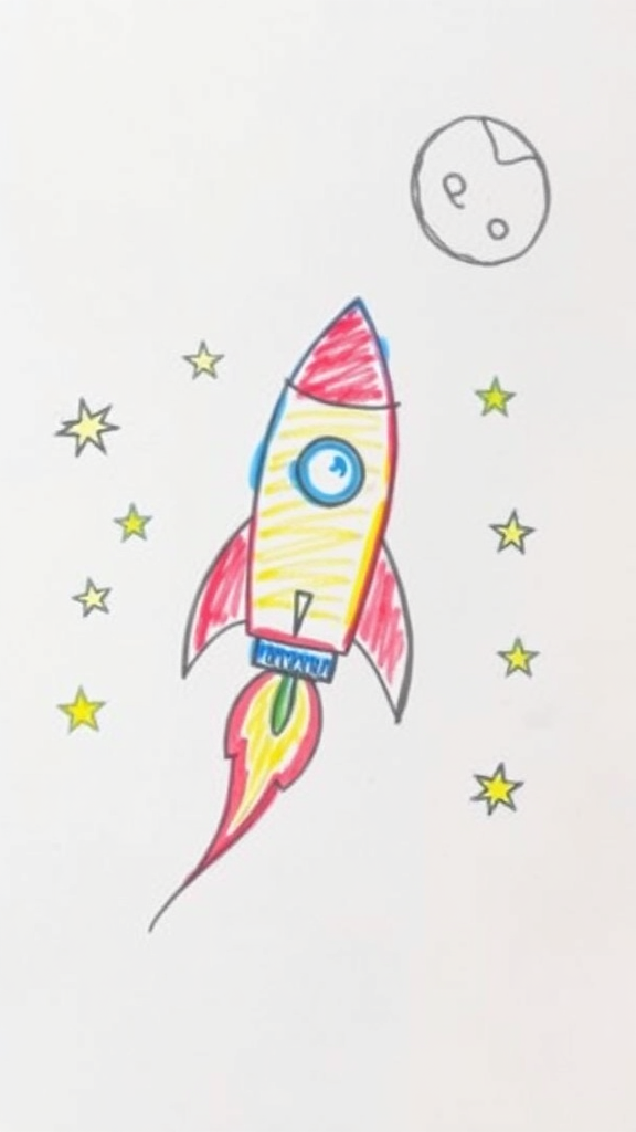 A playful child's crayon illustration on a blank sheet shows a crooked rocket ship soaring through space, surrounded by asymmetrical stars and a lopsided moon in the background, enhanced with vivid Crayola colors.