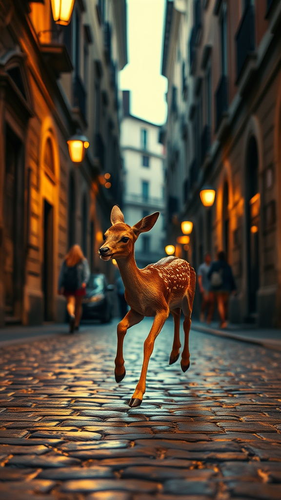 A playful fawn dashing through the historic streets of Rome, its laughter echoing under the soft glow of dim street lights, the scene captured in a vibrant, cinematic style with hyper-realistic details; the texture of ancient cobblestones contrasts with the graceful movement of the young deer, set against a breathtaking 4k backdrop, offering a dreamlike glimpse into the harmony of nature and history.