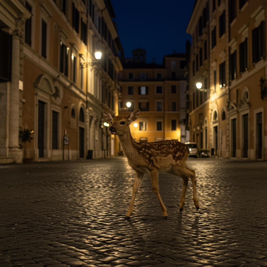 A playful fawn joyfully frolics through the cobblestone streets of Rome under the glow of dim streetlights, creating a cinematic and hyper-realistic scene in stunning 4k resolution, capturing intricate details as the baby deer giggles amidst the ancient architecture and soft shadows of the night.