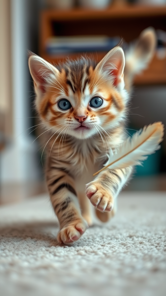 A playful kitten with bright eyes and a mischievous grin, darting around the room in pursuit of a fluttering feather, leaving a trail of soft fur and joyful chaos in its wake.