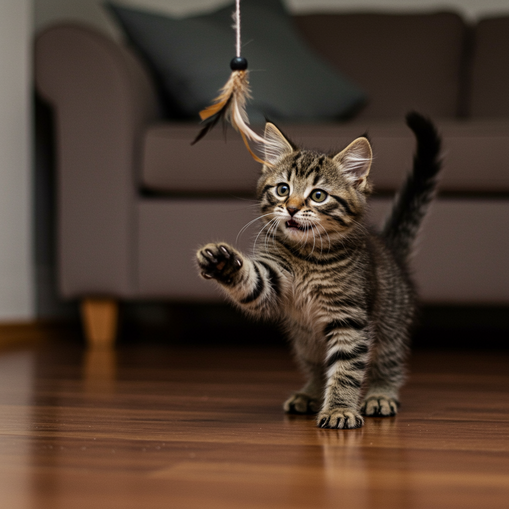 A playful kitten with fluffy fur hops around the living room, its tiny paws skidding across the polished floor as it pounces on a dangling string, wide-eyed with excitement and mischief.