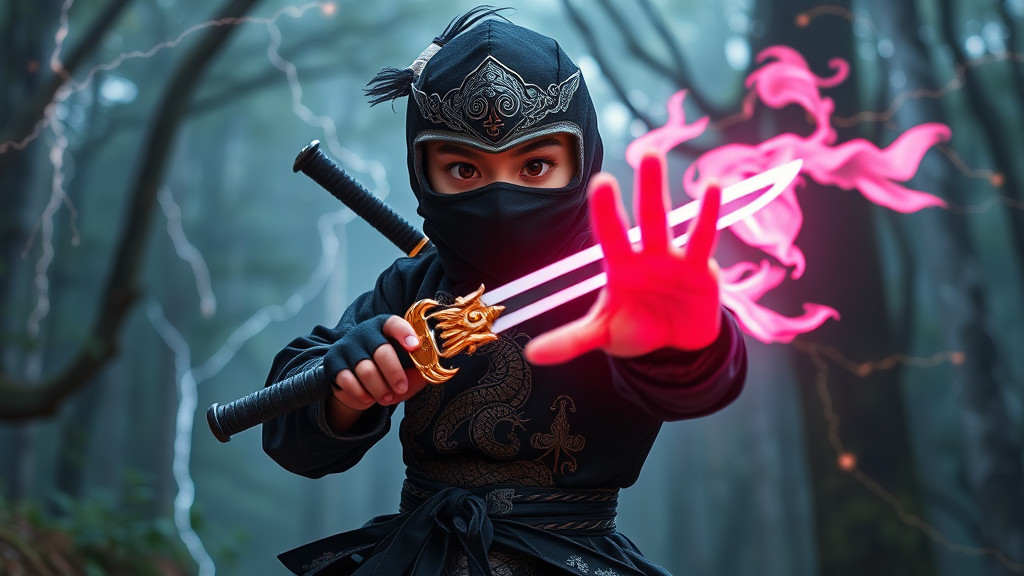 A playful ninja in midnight black traditional Chinese attire with shimmering silver accessories stands in a stealthy pose, gripping a kunai adorned with a dragon and phoenix pattern. Their eyes, captivating and mysterious, are illuminated by the gentle glow of pink fire that dances along the edges of their palms. The scene is an extraordinary display of elemental mastery with air swirling, lightning crackling, and the forest subtly bowing to their presence. This is a vivid representation of Gustatory-Auditory Synesthesia art, rendered in super high detail, capturing the essence of a mystical realm.