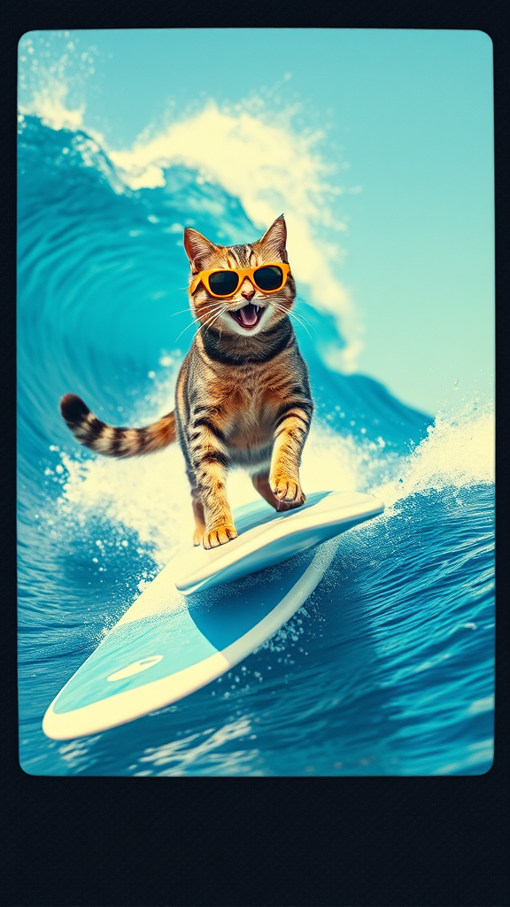 A playful tabby cat riding the crest of a towering wave on a sleek surfboard, its fur slightly tousled by the ocean breeze. The cat, wearing oversized, neon-orange sunglasses, has its mouth open in an exhilarated meow as it balances with impressive poise. The vibrant blue of the water contrasts sharply with the sunlit sky, all captured in a vintage-style Polaroid photo, evoking a sense of endless summer adventures.