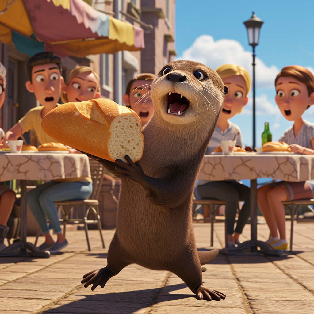 A playful, wide-eyed otter mischievously snatches a loaf of bread from a bustling seaside café table, its velvety fur glistening under the sun. The scene captures a blend of whimsy and humor, as the otter's agile movements and cheeky expression contrast with the flustered reactions of surprised diners, all depicted in a vibrant and dynamic Pixar-inspired animation style. The background features a picturesque waterfront setting, where the lively atmosphere complements the otter's delightful antics.