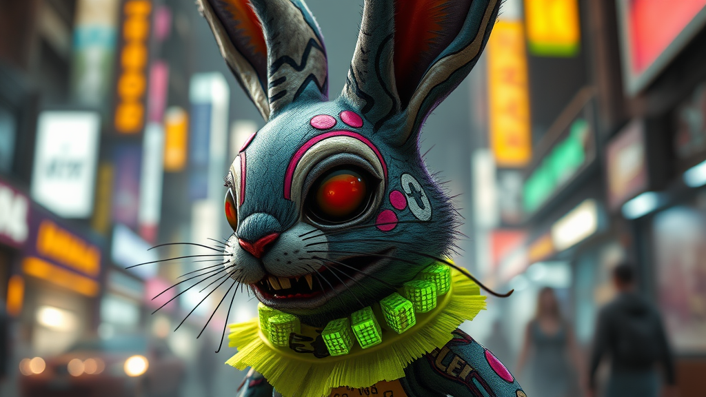 A playful yet dark cyberpunk zombie bunny, adorned with a vibrant neon-colored collar, featuring an otherworldly blend of honeycore and insectoid elements. Its fur, a riot of graffiti-esque colors, sports swirling patterns reminiscent of tangled urban street art. This whimsical creature embodies the collision of nature and technology, captivating with its animated aura amidst a backdrop of dystopian city lights, a mischievous smile hiding the enigmatic beauty of decay.