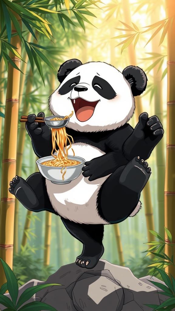 A plump panda balancing on one leg, joyfully devouring a bowl of steaming noodles, drawn in the intricate and dynamic anime style of Takeshi Obata for Shueisha, the scene is brought to life with vivid colors and fine details in ultra-high definition, capturing the whimsical nature of the moment amidst a lush bamboo forest backdrop, with sunlight filtering through the leaves casting soft shadows, creating a harmonious blend of nature and playful elegance.