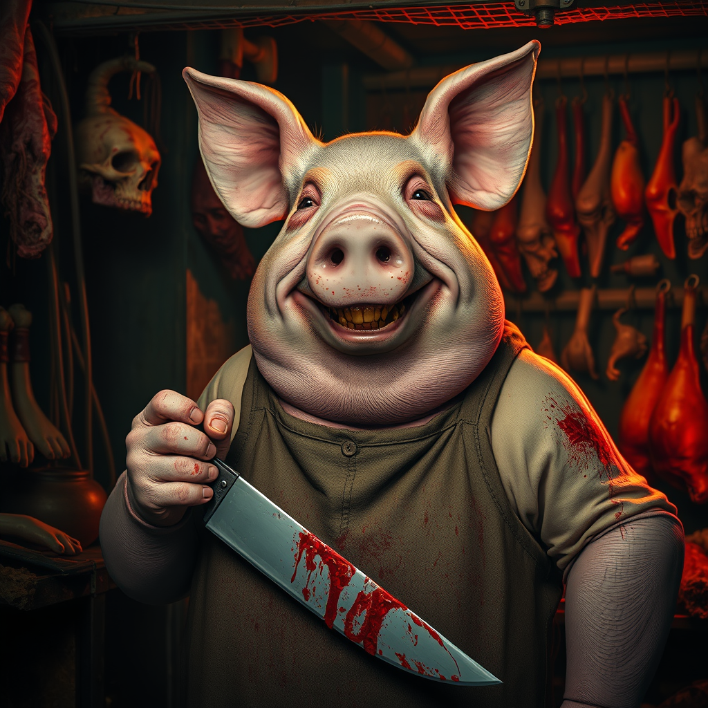 A plump pig working as a butcher in a dimly lit shop filled with unsettling human parts in the background, staring at the camera with a chilling grin and broken teeth, holding a blood-stained butcher's knife. The warm lighting casts dramatic shadows, enhancing the hyper-realism and intensity of the scene. The pig's clothes are splattered with blood, and the dramatic colors add to the eerie atmosphere. The photograph showcases a highly detailed, hyper-realistic style, reminiscent of trending works on ArtStation. The pig's features include unnatural elements, with a long neck and body, skewed eyes, and conjoined fingers. The setting suggests a world where imperfections and deformities are embraced, featuring oversaturated hues and unsettling anatomy, creating a hauntingly surreal and compelling visual narrative.