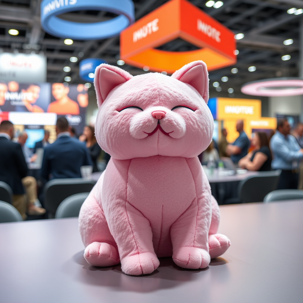 A plush pink stress-relief cat toy, subtly branded with a sleek company logo, sits prominently on a conference table. The background is a bustling conference scene, with professionals engaged in animated discussions and colorful banners showcasing innovative technologies. The cat's soft, velvety texture and playful expression invite attendees to reach out and give it a gentle squeeze, offering a moment of calm amidst the lively atmosphere. The scene is illuminated by the glow of overhead lights, reflecting a modern, energizing ambiance.