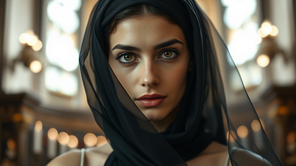 A poignant and elegant portrait inspired by Nadav Kander and Annie Leibovitz captures a beautiful Spanish widow, draped in a delicate black veil. Her expressive eyebrows and lovely, large, bright eyes convey a confident yet wistful expression. With an angelic face framed by subtle strapless attire and simple jewelry, the composition adheres to the golden ratio, enhancing her ethereal presence. Dramatic lighting adds depth, while the soft glow of candles and the blurred bokeh of a grand church interior create a cinematic CinémaScope setting. The world exudes a soft, melancholic beauty, rich in detail and emotion.