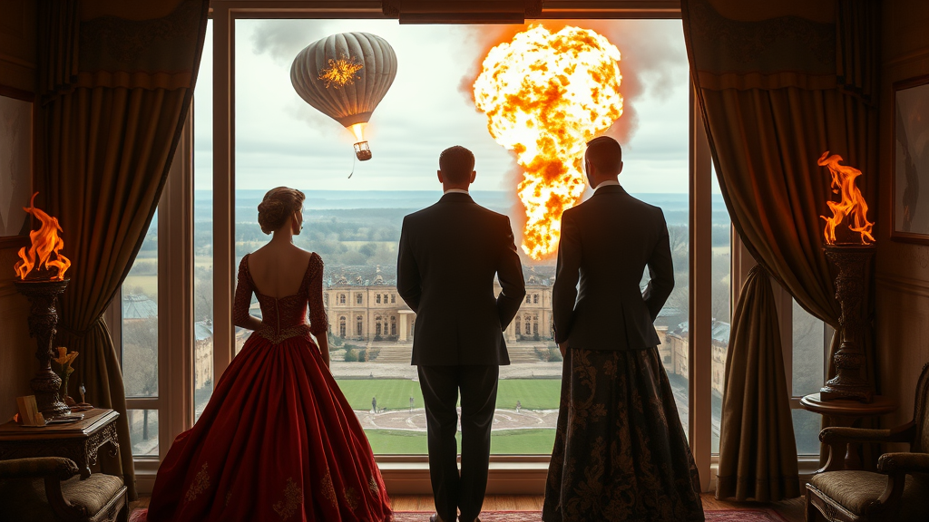 A poised couple, dressed impeccably in the finest fashion of the late 19th century, stands with dignity by their expansive window, overlooking their sprawling estate. Their expressions remain stoic and self-assured as they witness a harrowing spectacle: a flaming hot air dirigible descends agonizingly onto their front grounds, erupting in a deafening explosion. Despite the pandemonium outside, the couple maintains an unyielding stance, exuding an aura of grace and resilience that speaks to their inner fortitude. This contrast between their regal composure and the blazing chaos outside crafts a scene of striking drama and imagination. The intricate designs of their clothing and the opulent decor of the room provide layers of depth and richness, while the fierce flames and billowing smoke inject a sense of urgency and peril. The resulting effect is a mesmerizing fusion of historical grandeur and contemporary action, celebrating the indomitable human spirit in the face of calamity.
