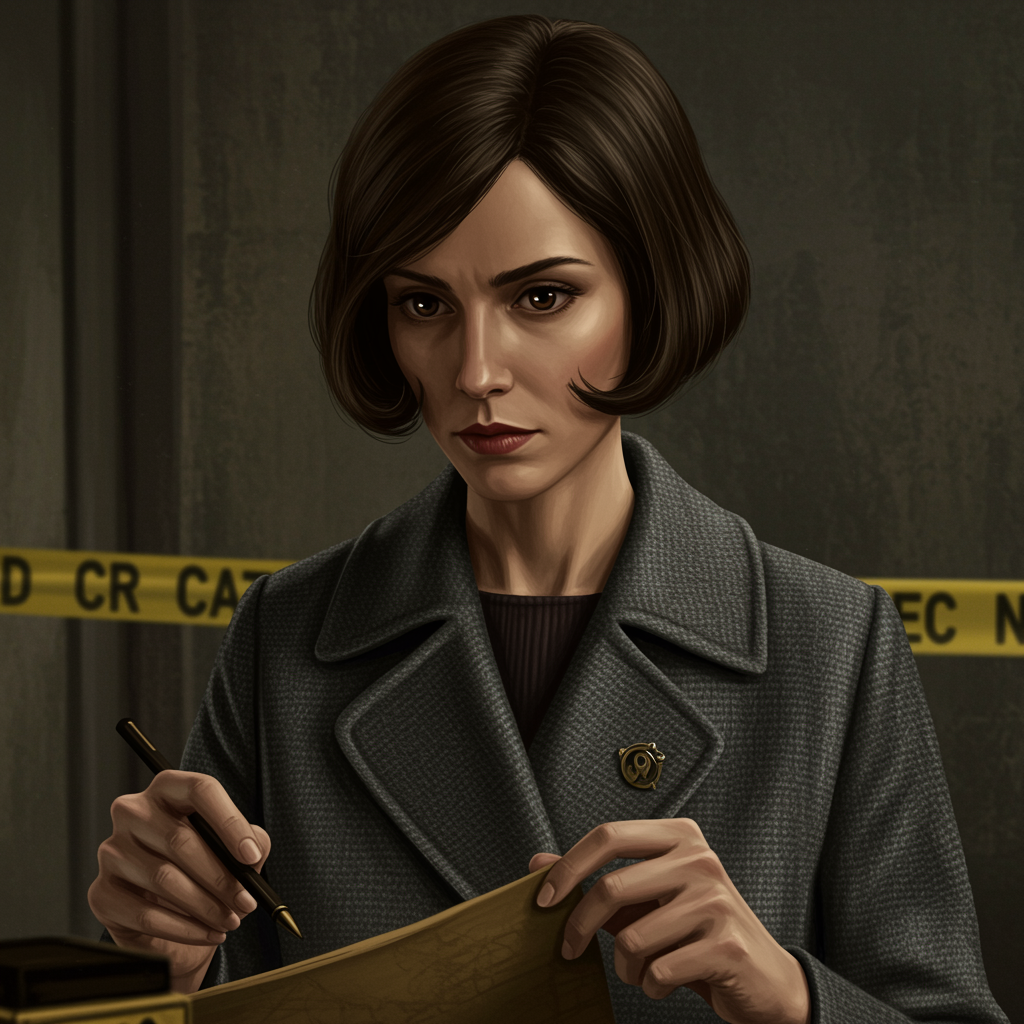 A poised female detective with a chic bob hairstyle and keen brown eyes, dressed in an elegant gray detective coat, is meticulously analyzing clues at a shadowy crime scene. Her half-body portrait, skillfully crafted in the distinctive style of Wes Anderson, showcases her focused expression against a textured, gritty backdrop. The scene captures an expressive mood, blending meticulous detail with artistic flair, spotlighting the detective's sharp intellect and unwavering determination.
