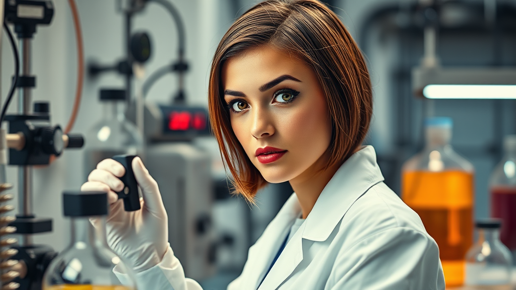 A poised female scientist with a sleek bob and luminous hazel eyes, donned in an immaculate white lab coat, is deeply engaged in experiments within an advanced laboratory setting, captured in a half-body portrait style reminiscent of Henri Rousseau's expertise, with intricate details, set against a backdrop of futuristic apparatus, embodying an expressive and vibrant style.