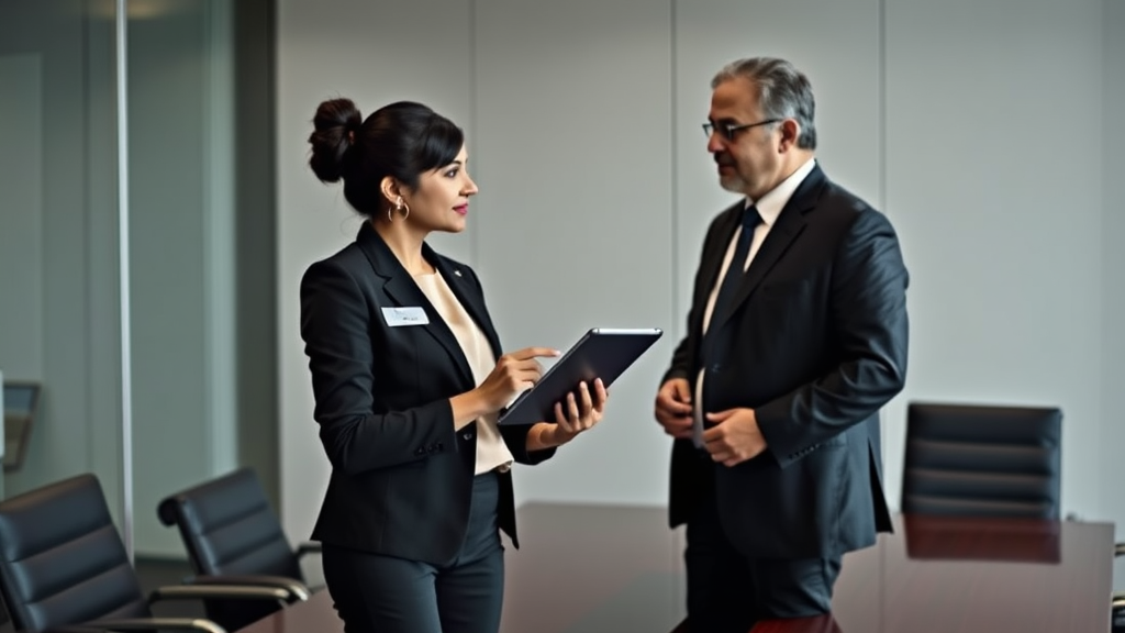 A poised Indian woman in her late 30s, dressed in a crisp black blazer with a silver name badge on the lapel reading "Aparna Mehta," stands confidently in the modern conference room, her stylishly pulled back hair tied in a neat bun. She wears a creamy beige blouse underneath her jacket, adding a touch of elegance to her professional attire. In one hand, she holds a sleek tablet, her slender fingers deftly scrolling through the digital screens with gentle gestures as she engages in conversation with the male client standing across from her. The visitor, Lalit Dixit, a middle-aged businessman, sports a tailored black suit, his crisp white shirt accentuating his commanding presence. His square jawline and sharp features give him a distinguished, authoritative air as he converses with Aparna. The animated discussion suggests a high-stakes business deal, their voices hushed and structured as they navigate the complexities of their negotiation. The conference room exudes a sense of upscale sophistication, its polished dark-wooden table shining with a subtle sheen. The walls are adorned with select, minimalist artwork, their muted tones reflecting the subdued colors of the manikin spires in the distance. Wide windows behind them offer a majestic view of the city skyline, framed by twilight hues casting a moody, atmospheric light. As the conversation unfolds, Aparna occasionally nods, her brown eyes locking onto Lalit's as she calls up figures on the tablet, her fingers fast and precise. Meanwhile, on the periphery of the room, delicate silhouettes of fine art hang like murals, their details dancing in the ceiling's dropped lighting to create intricate strips of halation. Attention to the nuanced textiles of the chairs and table – designed by a high-profile Indian brand – immerses the setting further into expensive sensibilities, abandoned in the calm solitariness accompanying this boardroom discussion.