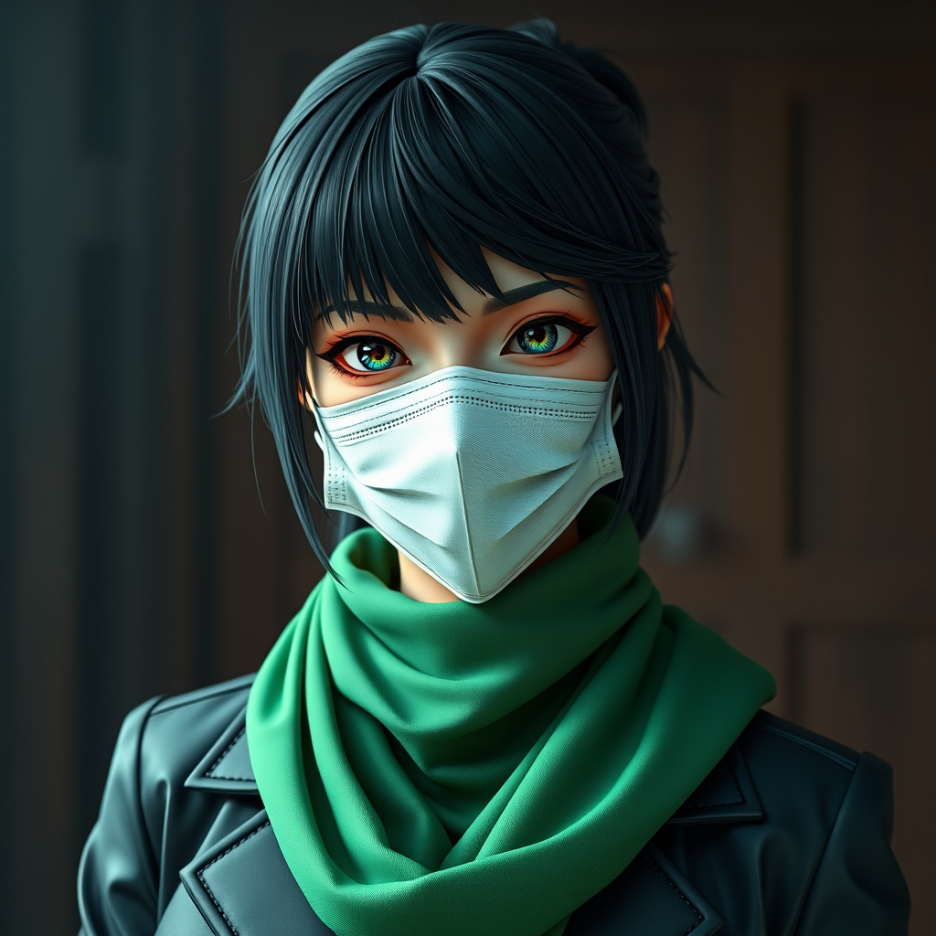A poised woman with jet-black hair, wearing a sleek dark jacket and a vibrant jade scarf, sports a cloth face mask. Rendered in an anime-inspired 3D style with exceptional detail, she is captured in an ultra-high definition 8k using the Unreal Engine. The scene is characterized by an expressive and dynamic atmosphere, reflecting both mystery and intensity, presented in a striking 9:16 aspect ratio.