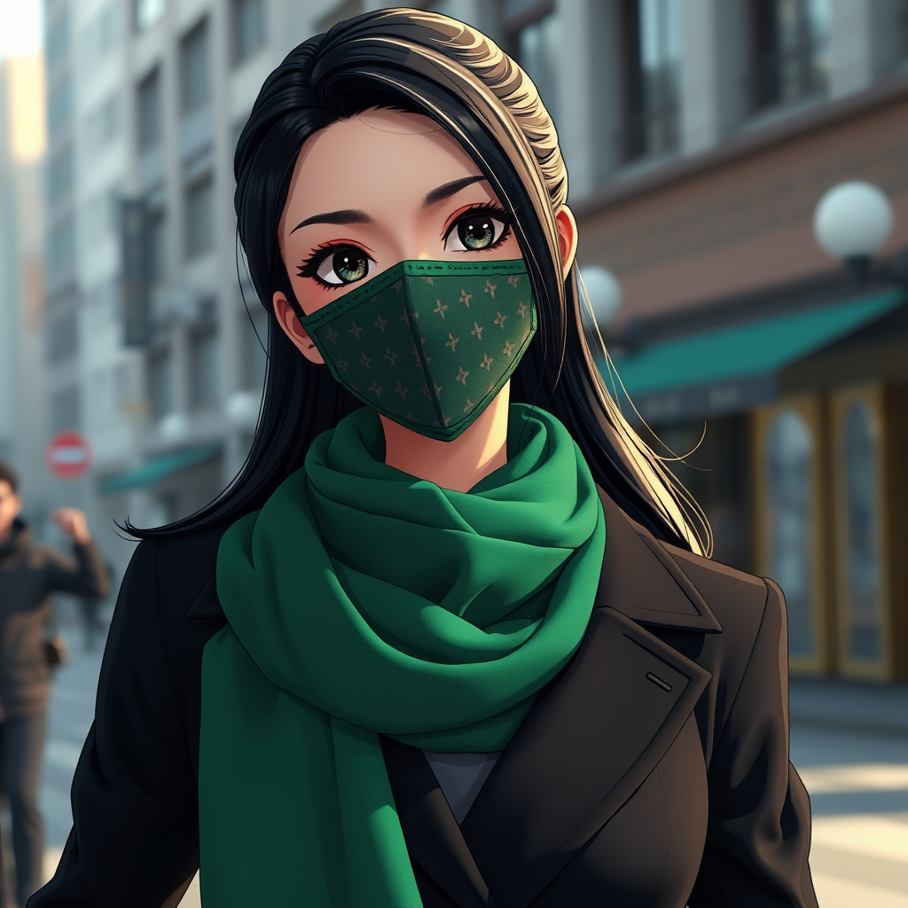 A poised woman with sleek black hair, wearing a dark tailored coat and a vibrant emerald scarf, complemented by a patterned cloth face mask, anime style, rendered in ultra-realistic 3D, 8k resolution, utilizing the Unreal Engine, aspect ratio 9:16, Niji 5, with an expressive and dynamic style, set against a sophisticated urban backdrop.