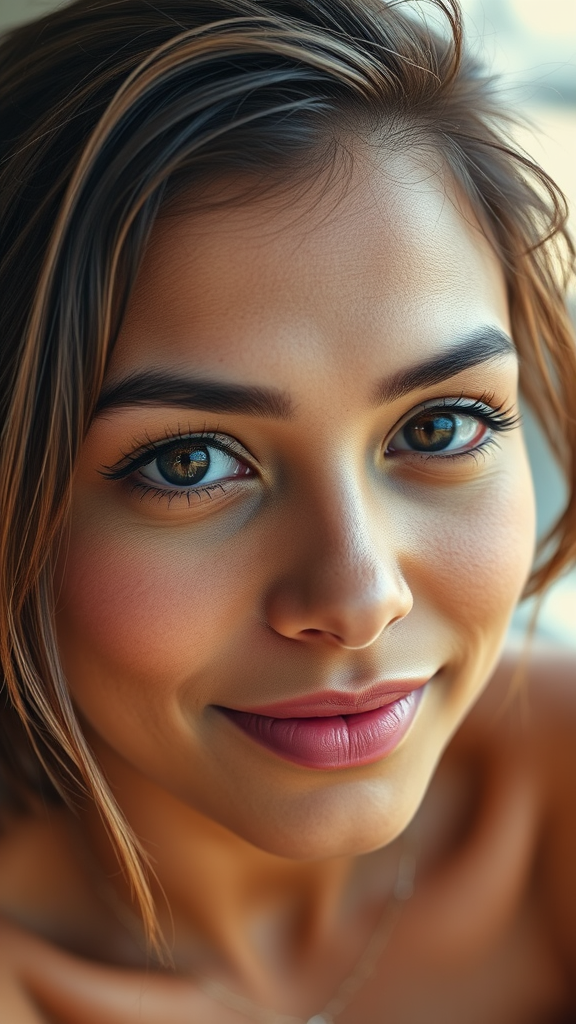 A Polaroid captures the face of a 24-year-old Mizo-Lebanese woman, exuding exotic beauty with a welcoming demeanor. Her medium-tan skin melds with a touch of olive, reflecting a balanced bronze from frequent sun exposure. She wears understated makeup, with a soft blush on her cheeks and natural pink lips, highlighting her skin's texture and visible pores. Her octagonal, gentle, deep brown eyes, are enhanced by gracefully long eyelashes. A tousled, shaggy bob frames her face, while her neatly shaped eyebrows accentuate her delicate features, adding harmony to her captivating expression.