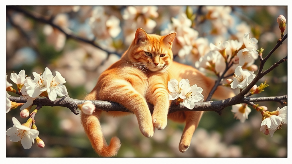 A Polaroid snapshot captures a ginger tabby lounging on a blooming branch, with soft sunlight casting gentle shadows as the cat's hind legs dangle gracefully.