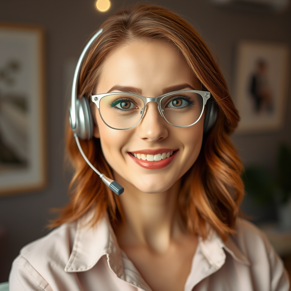 A polished and approachable customer service manager, Sofia, greets clients with a soft voice and an attentive demeanor, showcasing her sharp expression behind elegant silver frames that reflect her quick and insightful thinking. Her chin-length auburn hair falls in loose waves down her back, balancing a minimalist silver headset that seals precise communication with customers. A genuine and encouraging smile, softened by a gentle laugh line at the corner of her mouth, underscores her remarkable capacity to empathize with her customers' concerns. Soft pastel hues, likely pinks or blues, coat her small studio or shared office space, camouflaging personal photos and elegant artwork into tasteful, muted backdrops for seamless conversations.