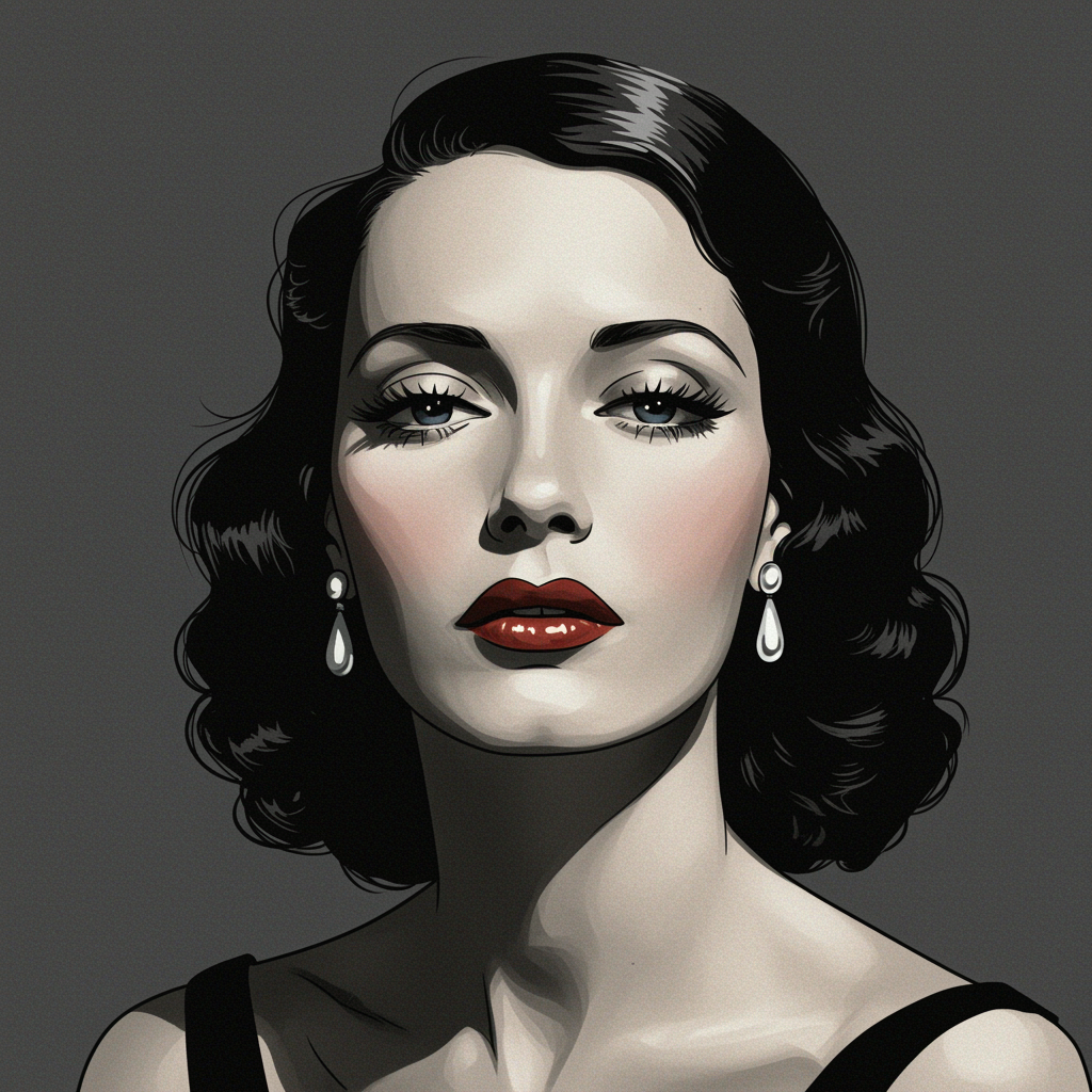 A pop art style illustration of a woman's face inspired by glamorous Hollywood portraits, rendered in dark gray and light black tones. The illustration draws on the charming character style of Mort Künstler and Rollerwave, with influences from large format film and painted illustrations. The artwork is characterized by textural elements like jpeg artifacts, creating a unique visual aesthetic. The composition explores unconventional features such as elongated neck, and abstract anatomy, contributing to an avant-garde, surreal appearance. Elements like duplicated and deformed limbs, along with exaggerated proportions, enhance the otherworldly vibe, creating an intentionally flawed yet captivating portrait. The work embraces the beauty of imperfection in line with artistic exploration, making it a distinctive and memorable piece.