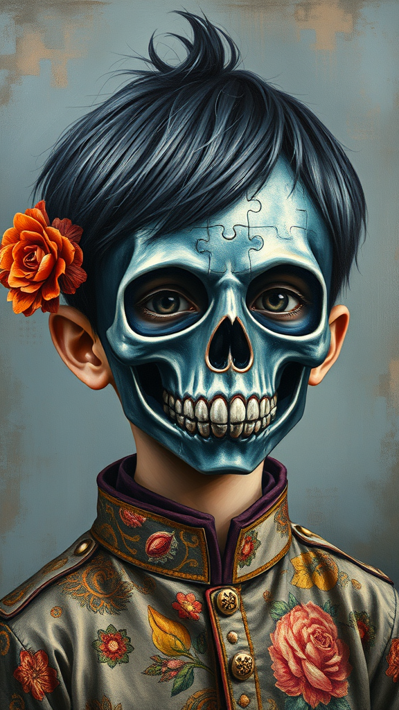 A pop surrealism oil painting of a boy composed of puzzle pieces, wearing a David Alejandro-inspired skull mask, exuding childlike innocence and charm, rendered on a panel. The artwork features a palette of dark navy and light bronze hues. It incorporates elements of flowerpunk and traditional costumes, capturing an essence of whimsy. The piece is envisioned through the lens of women artists, infusing a unique feminine perspective.