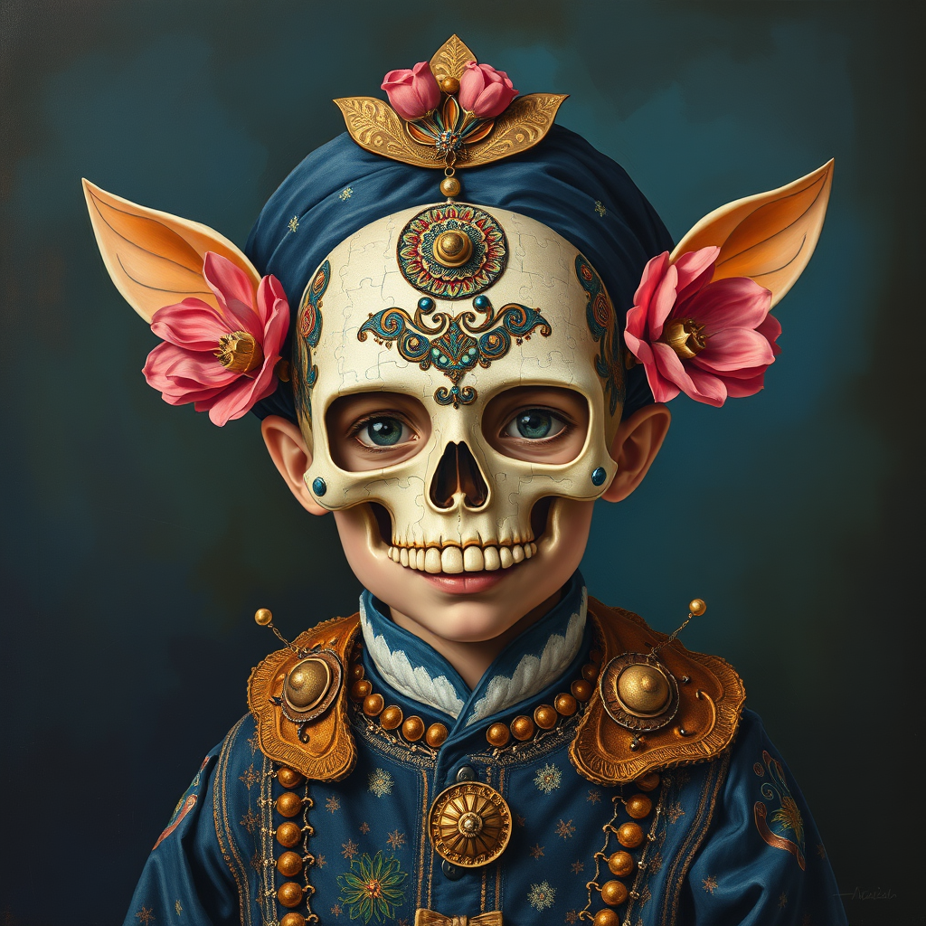 A pop surrealism painting of a whimsical boy assembled from puzzle pieces wearing an intricately designed David Alejandro-inspired skull mask, exuding childlike innocence and charm. The artwork is rendered in oil on panel, embracing the vibrant aesthetic of flowerpunk with a contrasting palette of deep navy and soft bronze. The boy is adorned in traditional costumes that enhance the fantastical elements, a vision realized by women artists who blend surrealism with enchanting storytelling.